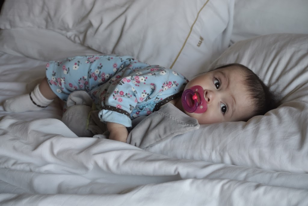 Standing up all by herself! Just for a second, but still. Also, when we are holding her hands to help her stand, if you put a ball in front of her she toddles around kicking it. So cute. And hard on my back having to bend over following her around holding her up, but mostly cute.